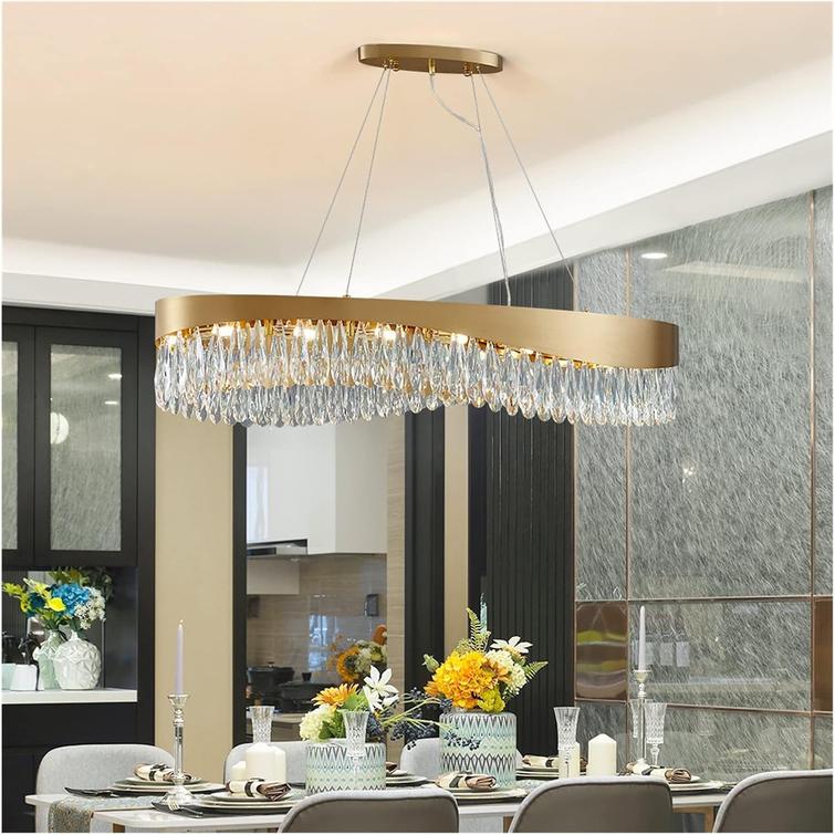 This stunning modern chandelier adds a touch of luxury to your dining room, kitchen, or hallway. Its elegant oval design and shimmering crystal accents create a warm, inviting glow. Perfect for enhancing the ambiance of your home, this affordable yet sophisticated lighting fixture is a statement piece that effortlessly blends modern and classic styles.
